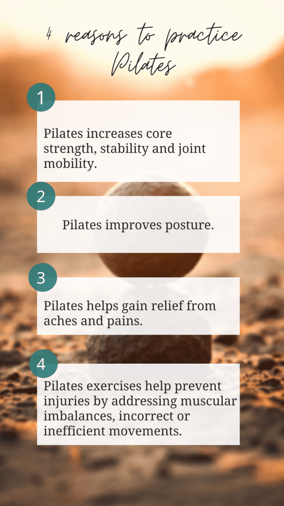 Pilates is a form of controlled movements, done slowly and with lower reps to help improve core strength, lengthen and tone the body, improve flexibility and assists with pain and injury prevention. Emphasis is placed on alignment, mind-body connection, breathing and balance and coordination. Pilates is not about being the fastest or doing the most reps.
